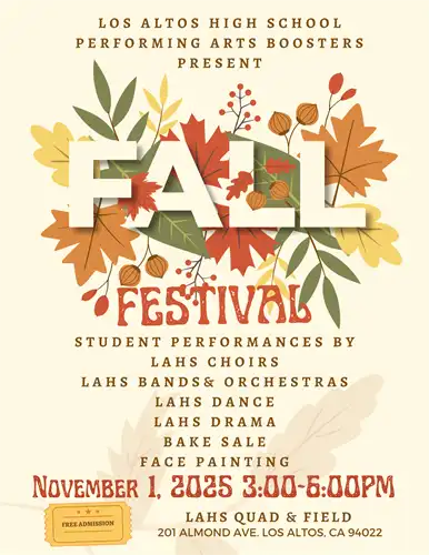 The LAHS Fall Festival is a fundraiser for Los Altos High School Instrumental Music Boosters. The funds raised support efforts to buy music, repair equipment, purchase new instruments, fund music clinicians and support staff as well as provide student scholarships. Thank you for your support!